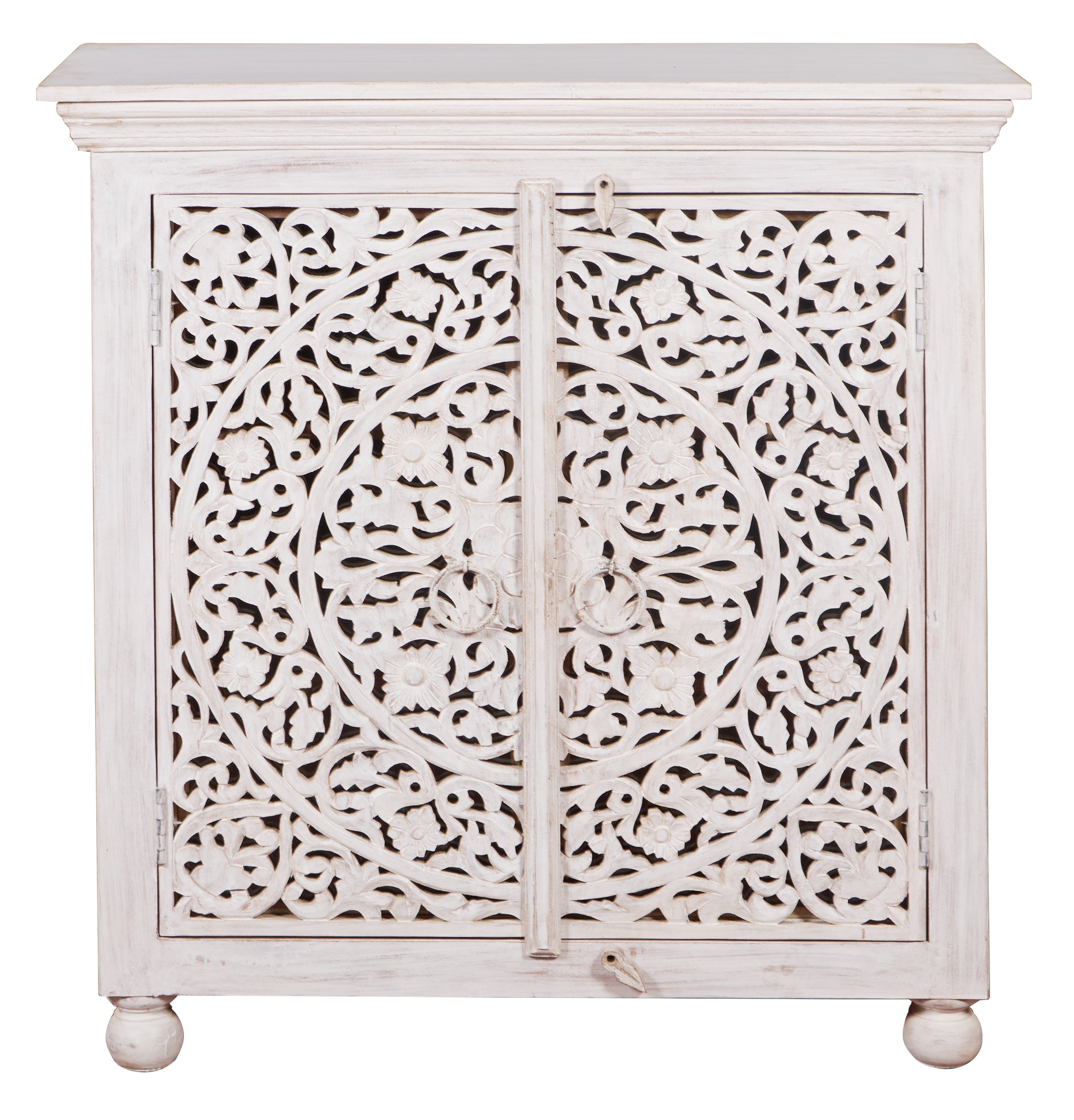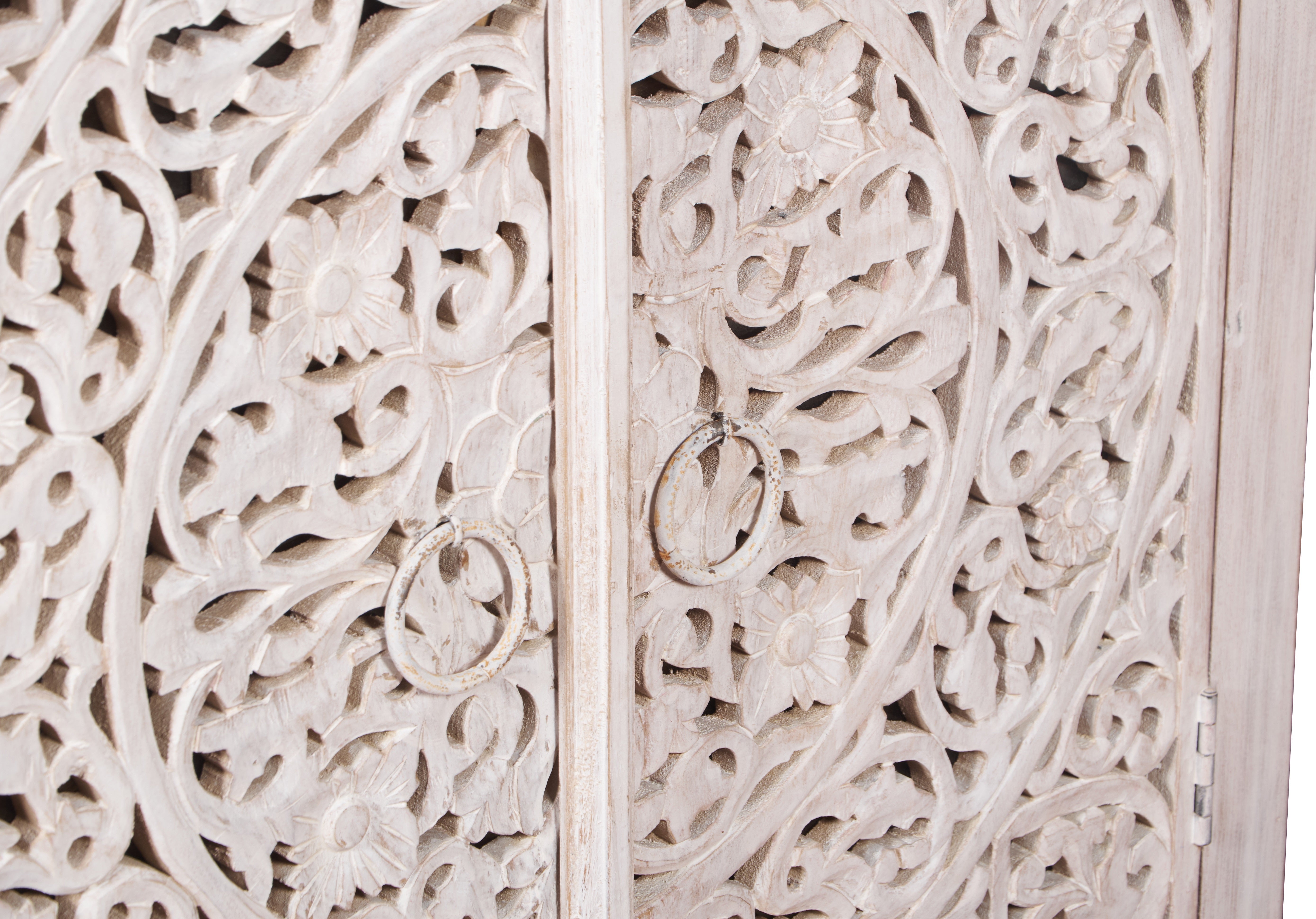 Hand carved with 3 shelves inside made from solid mango wood in the shape of delicate carving, this show-stopping storage piece has great interior space and it is ideal for living room entertainment, also can be used as an entryway piece.